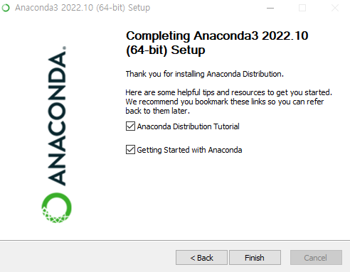[Finish] 버튼을 클릭해 아나콘다 설치를 완료한다.