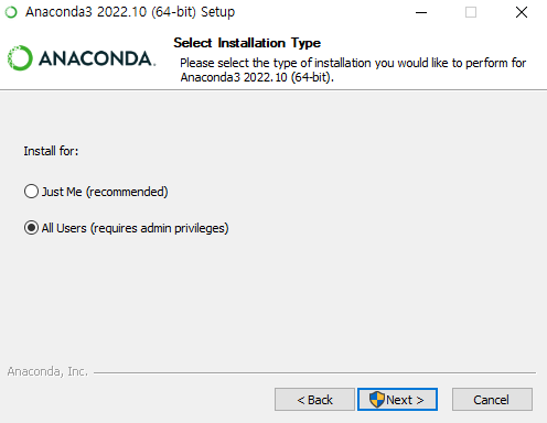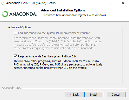 첫 번째 옵션은 아나콘다를 윈도우 환경 변수에 추가하는지를 설정하는 옵션