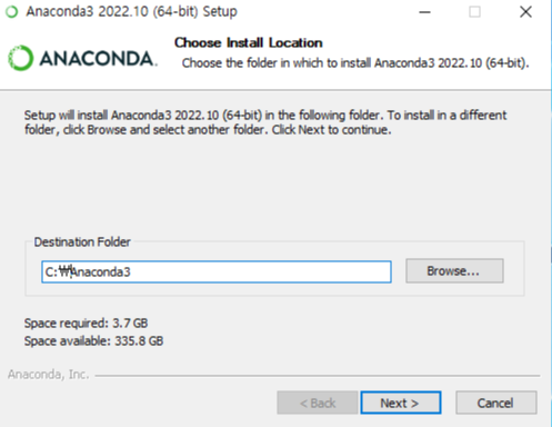 설치 경로는 나중에 쉽게 접근할 수 있도록 설치 경로를 위 이미지 경로화 같이 'C:\Anaconda3'로 경경한 후 [Next] 버튼 클릭
